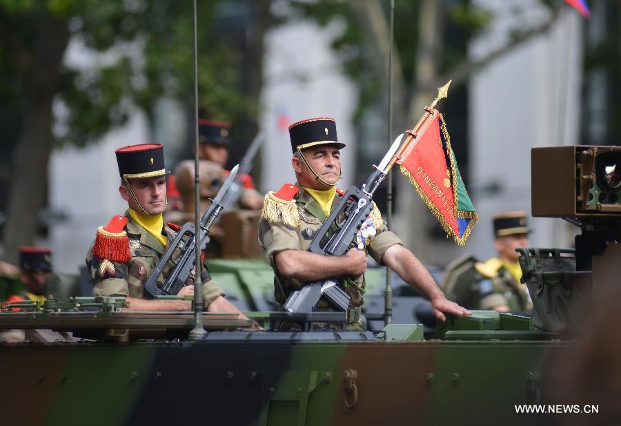 Soldiers of the tank regiment participate in the annual Bastille Day military parade on the Champs Elysees Avenue in Paris, France, on July 14, 2014. France celebrated National Day with a grand parade, which was participated by troops from 80 nations. (Xinhua/Li Genxing)