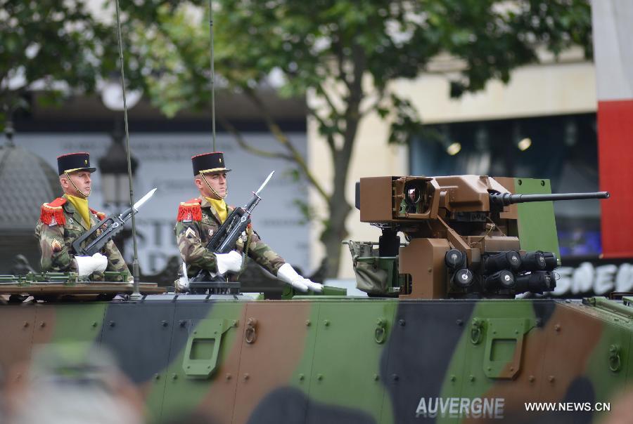 Soldiers of the tank regiment participate in the annual Bastille Day military parade on the Champs Elysees Avenue in Paris, France, on July 14, 2014. France celebrated National Day with a grand parade, which was participated by troops from 80 nations. (Xinhua/Li Genxing)