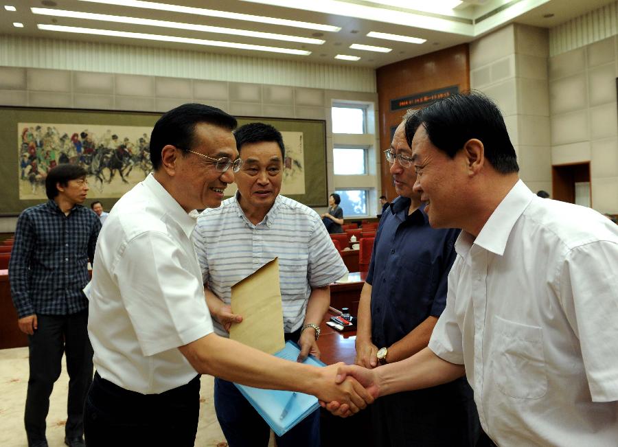 | Chinese Premier Li Keqiang shakes hands with a businessman during a symposium attended by the country's leading businessmen from sectors including foreign trade, construction, finance and the Internet in Beijing, capital of China, July 14, 2014. (Xinhua/Rao Aimin) |
