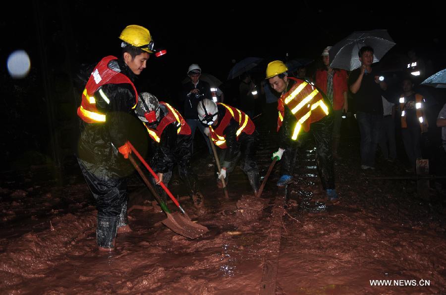 Workers clear mud off the railway in Xinzhan Township, Tongzi County, southwest China's Guizhou Province, July 15, 2014. A rain-triggered landslide on Monday affected train services between Guizhou and Sichuan provinces. Fourteen trains were canceled after the landslide hit the railway section between the stations of Taibai and Mengdu in the city of Zunyi. (Xinhua/Jiang Longrong)