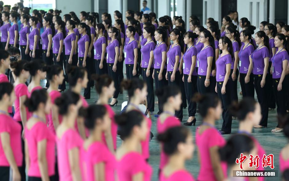 Volunteers for the 2014 Nanjing Youth Olympic Games receive training on July 13, 2014. On July 13, 491 ceremony volunteers for the 2014 Nanjing Youth Olympic Games make public appearance. All of them are from 18 colleges including Southeast University, Nanjing Agriculture University and Nanjing Sport Institute. (CNS/Yang Bo)