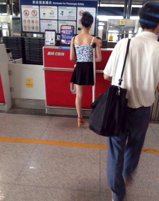 On July 8, 2014, a netizen put the photos of a one-legged woman wearing high heel at the Beijing airport on the Internet, with comment "What a beautiful girl!"