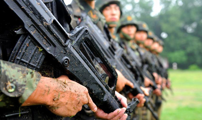 On July 12, 2014, soldiers of the People's Armed Police Force receive training in the rain in Nanjing, east China's Jiangsu Province. The training aims to temper their willpower and help them make good preparations for the security work of the Nanjing 2014 Youth Olympic Games. (Photo/XHBY.NET)