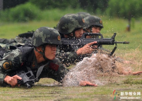 On July 12, 2014, soldiers of the People's Armed Police Force receive training in the rain in Nanjing, east China's Jiangsu Province. The training aims to temper their willpower and help them make good preparations for the security work of the Nanjing 2014 Youth Olympic Games. (Photo/XHBY.NET)