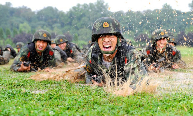 On July 12, 2014, soldiers of the People's Armed Police Force receive training in the rain in Nanjing, east China's Jiangsu Province. The training aims to temper their willpower and help them make good preparations for the security work of the Nanjing 2014 Youth Olympic Games. (Photo/XHBY.NET)