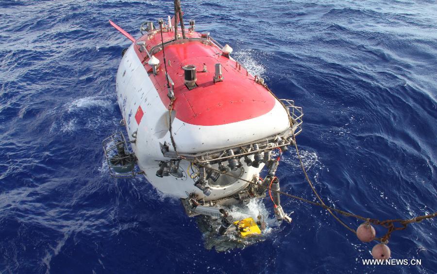 China's manned submersible Jiaolong is ready to dive into the sea for scientific research, July 16, 2014. Jiaolong and its support ship the Xiangyanghong 09 are on a scientific research voyage in the northwest Pacific Ocean, during which it will research cobalt-rich crusts and life forms inhabiting the bottom of the sea. (Xinhua/Luo Sha