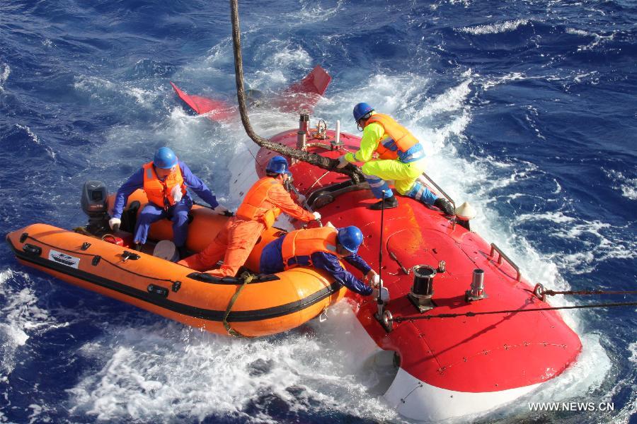| Staff members unravel cables for China's manned submersible Jiaolong to make it dive into the sea for scientific research, July 16, 2014. Jiaolong and its support ship the Xiangyanghong 09 are on a scientific research voyage in the northwest Pacific Ocean, during which it will research cobalt-rich crusts and life forms inhabiting the bottom of the sea. (Xinhua/Luo Sha) |