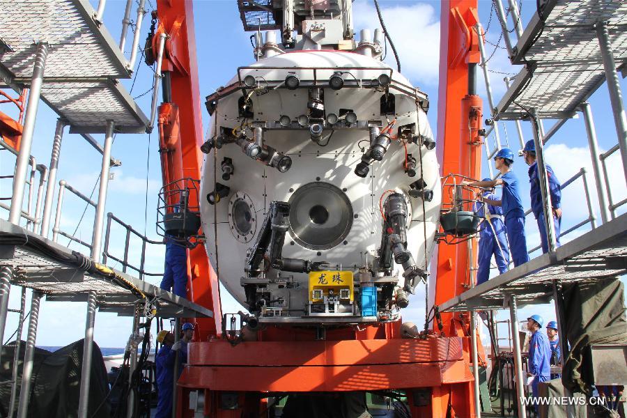 China's manned submersible Jiaolong prepares to be released into the sea for scientific research from its carrier Xiangyanghong 09, July 16, 2014. Jiaolong and its support ship the Xiangyanghong 09 are on a scientific research voyage in the northwest Pacific Ocean, during which it will research cobalt-rich crusts and life forms inhabiting the bottom of the sea. (Xinhua/Luo Sha)