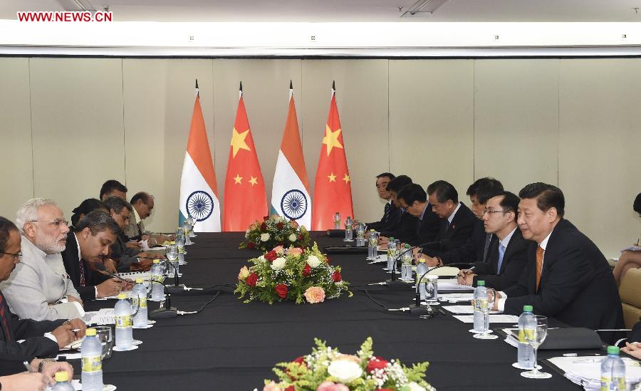 Chinese President Xi Jinping(1st R) meets with Indian Prime Minister Narendra Modi in Fortaleza, Brazil, July 14, 2014. (Xinhua/Li Xueren)