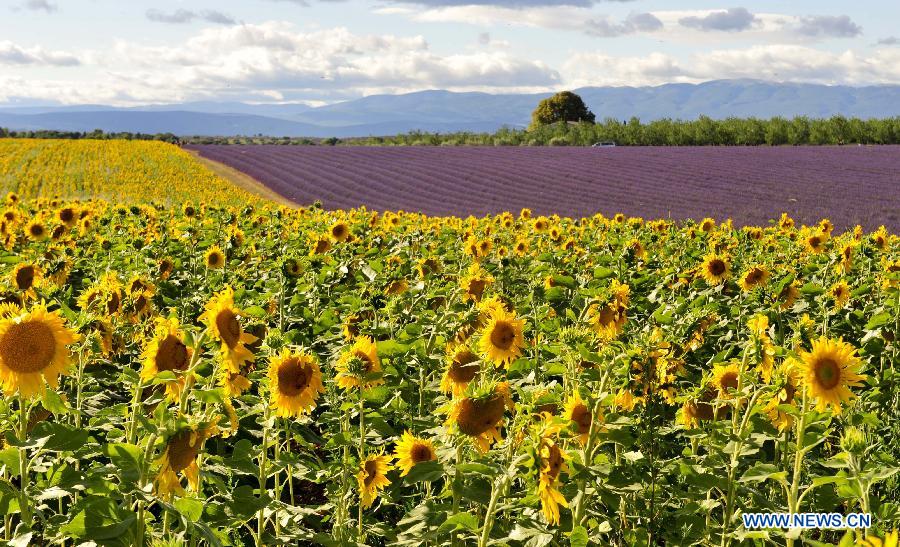 Photo taken on July 10, 2014 shows sunflower and lavender fields at Valensole of Provence, south of France. (Xinhua/Ye Pingfan)