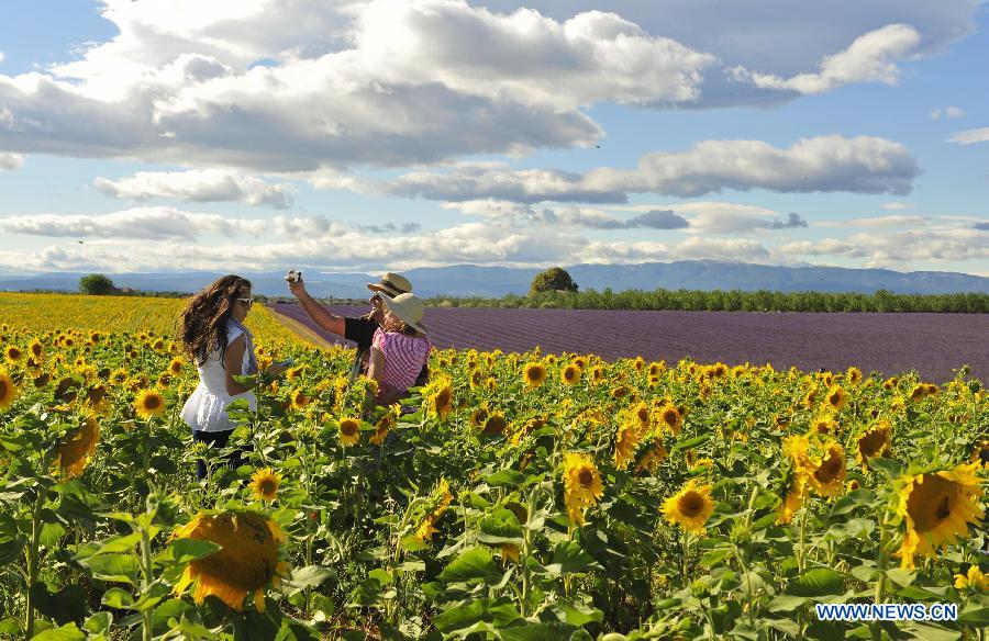 Photo taken on July 10, 2014 shows tourists take photos in sunflower field at Valensole of Provence, south of France. (Xinhua/Ye Pingfan)