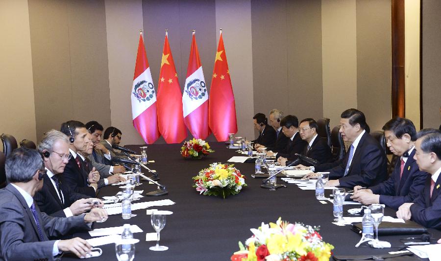 Chinese President Xi Jinping (3rd R) meets with Peruvian President Ollanta Humala in Brasilia, Brazil, July 16, 2014. (Xinhua/Liu Jiansheng)