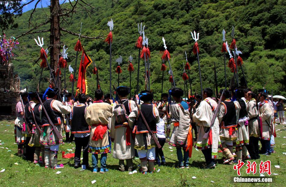 Qiang people hold a solemn ceremony of mountain offer on June 6 of the lunar calendar, praying for good weather and thanking God for blessing respectively in Mao county, Sichuan. The sacrifice event will last till June 27 in lunar calendar. (CNS/ He Qinghai)