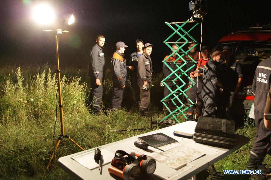 Rescue workers are seen on the debris at the crash site of a passenger plane near the city of Shakhtarsk in Ukraine's Donetsk region, July 17, 2014. The crash of a Malaysian passenger plane in Ukraine on Thursday was shrouded in mystery of a deliberate attack, with Kiev trading accusations of blame with separatists and Moscow. (Xinhua/Alexander Ermochenko)