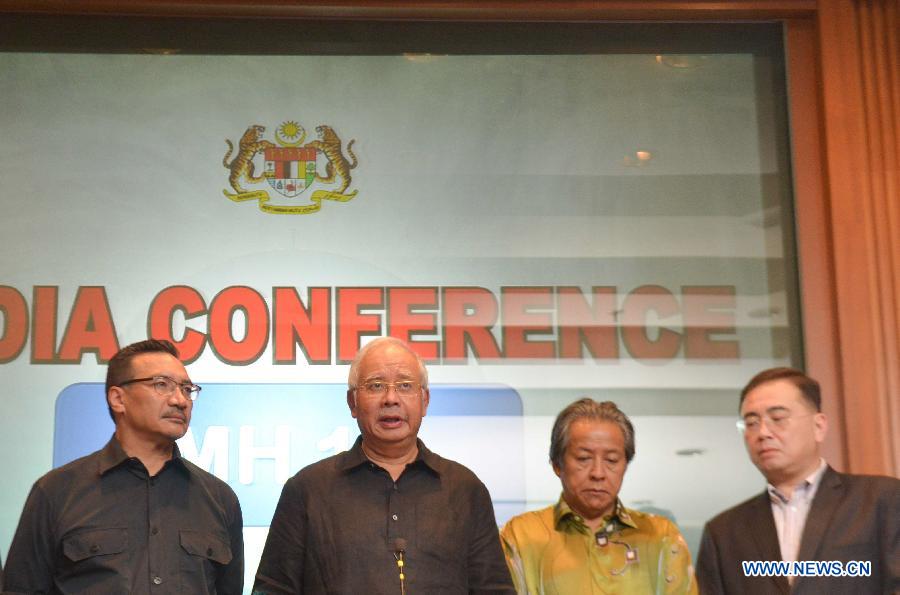 Malaysian Prime Minister Najib Razak (2nd L) attends a press conference at a hotel at the Kuala Lumpur International Airport, in Kuala Lumpur, Malaysia, July 18, 2014. Malaysian Prime Minister Najib Razak said here Friday at a press conference that the MH17's flight route was declared safe by the International Civil Aviation Organization (ICAO), adding that the International Air Transportation Association had stated that the airspace the aircraft was traversing was not subject to restrictions. (Xinhua/Chong Voon Chung)