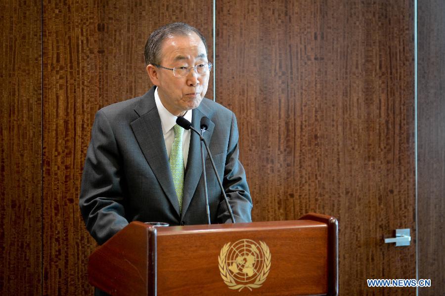 United Nations Secretary-General Ban Ki-moon speaks to media reporters at the UN headquarters in New York, on July 17, 2014. UN Secretary-General Ban Ki-moon on Thursday expressed deep condolences over the crash of a Malaysian flight carrying 295 people, calling for a "full and transparent investigation" into it. (Xinhua/Niu Xiaolei)