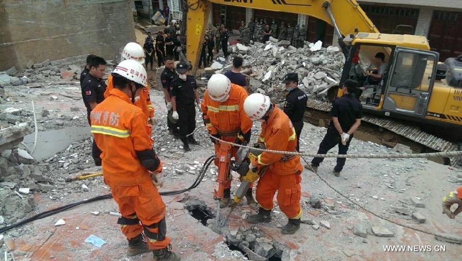 Rescuers work at the site of landslide in Dakuo Village of Zhijin County in the city of Bijie, southwest China's Guizhou Province, July 17, 2014. Six people died and another two were injured in the rain-triggered landslide here, local authorities said on Friday. Rainstorms have lashed Guizhou this week, triggering landslides and floods in many parts of the province. (Xinhua)