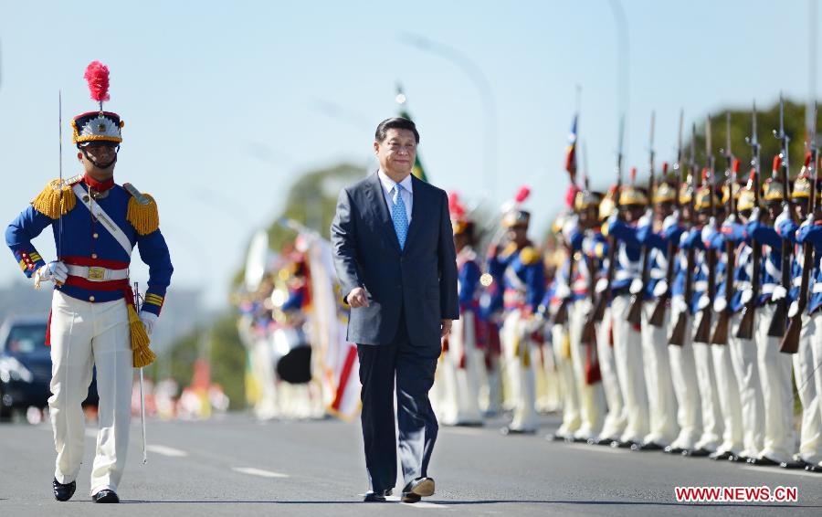 Chinese President Xi Jinping (C) attends a welcome ceremony held for him by his Brazilian counterpart Dilma Rousseff in Brasilia, Brazil, July 17, 2014. (Xinhua/Xie Huanchi)