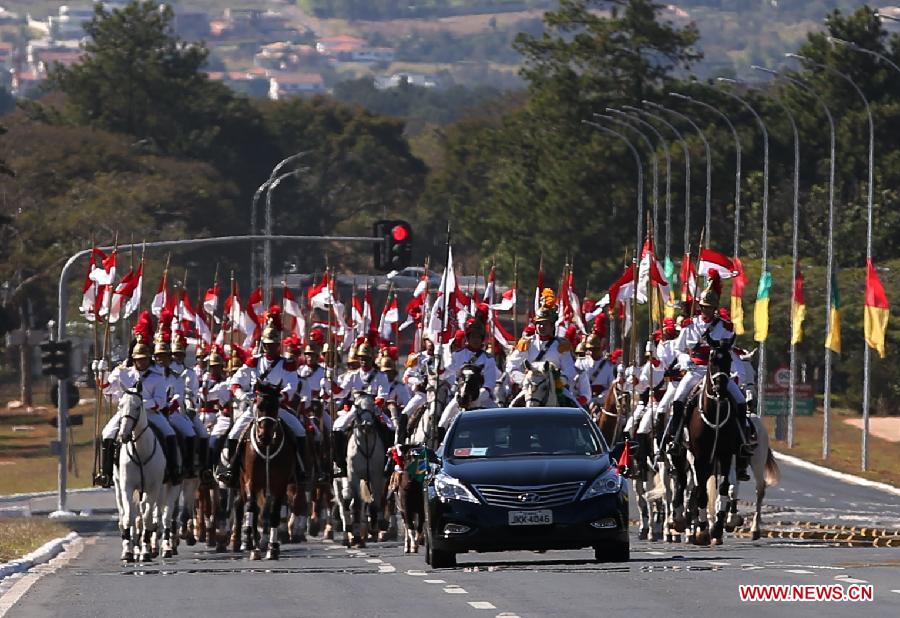 The car of Chinese President Xi Jinping is seen during a welcome ceremony held for him by his Brazilian counterpart Dilma Rousseff in Brasilia, Brazil, July 17, 2014. (Xinhua/Lan Hongguang)