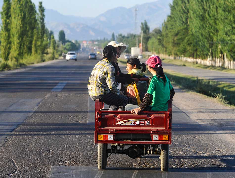 Farmers go home after a day’s work in the lavender field. (Photo/Xinhua)