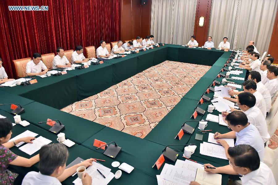 Chinese Vice Premier Zhang Gaoli (4th L), also a member of the Standing Committee of the Political Bureau of the Communist Party of China Central Committee, attends a symposium about developing Maritime Silk Road and accelerating the opening-up and economic development of Fujian in Fuzhou, capital of southeast China's Fujian Province, July 19, 2014. Zhang Gaoli made an inspection tour in Fujian Province from July 17 to 19. (Xinhua/Li Tao)