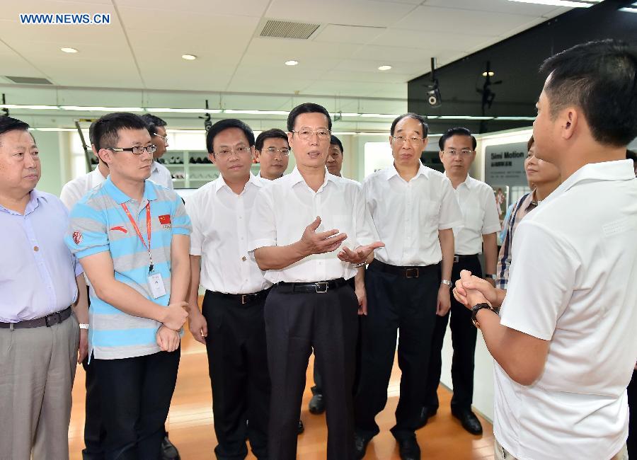 | Chinese Vice Premier Zhang Gaoli (C), also a member of the Standing Committee of the Political Bureau of the Communist Party of China Central Committee, visits ANTA Sports Products Limited in Xiamen, southeast China's Fujian Province, July 17, 2014. Zhang Gaoli made an inspection tour in Fujian Province from July 17 to 19. (Xinhua/Li Tao) |