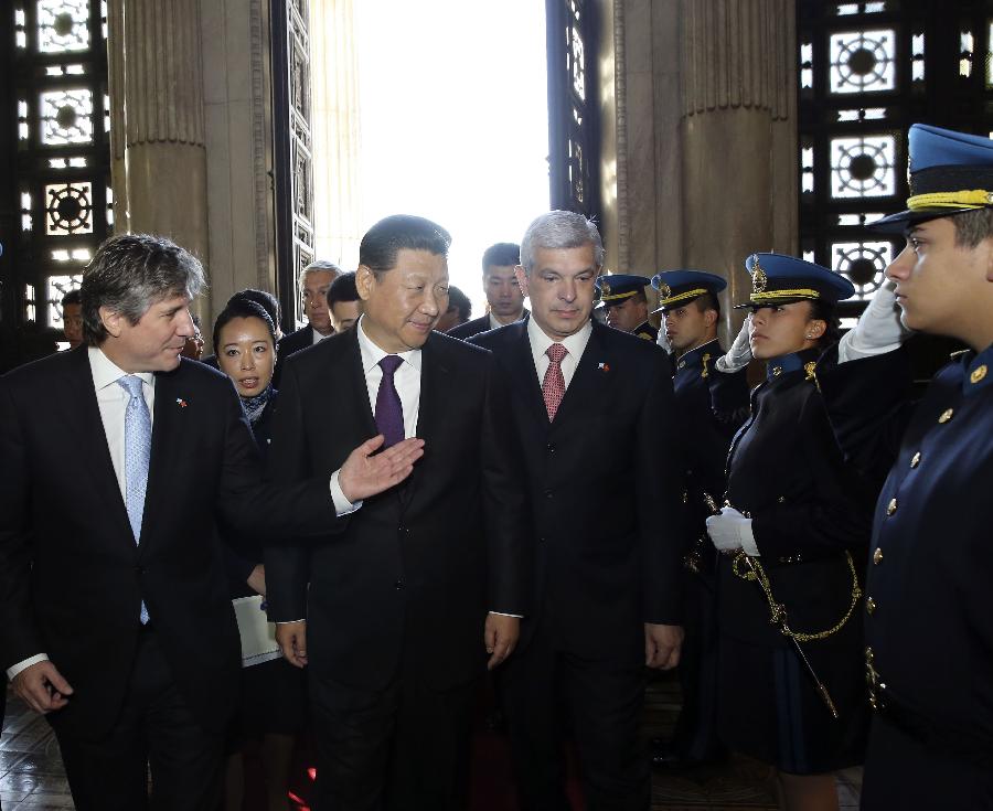 | Chinese President Xi Jinping (2nd L, front) meets with Argentine Vice President and Senate President Amado Boudou (1st L, front) and Chamber of Deputies President Julian Dominguez (3rd L, front) in Buenos Aires, Argentina, July 19, 2014. (Xinhua/Ding Lin) |