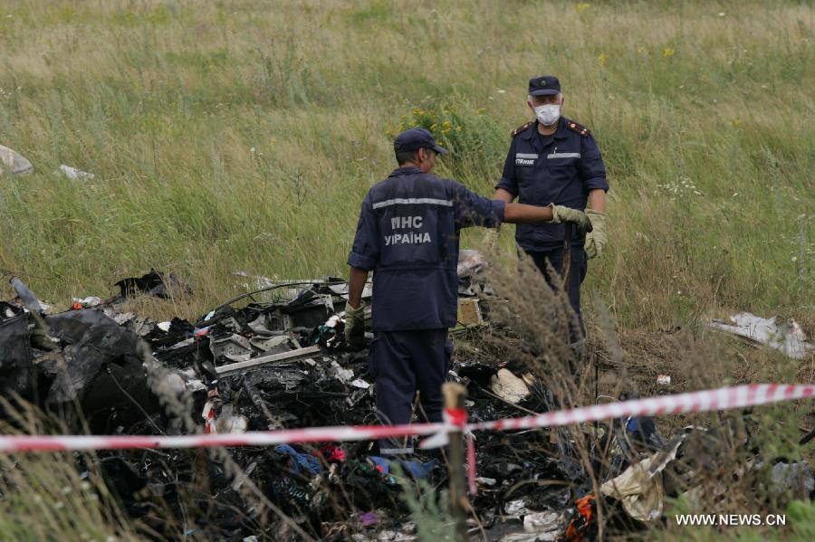 Photo taken on July 20, 2014 shows the debris at the crash site of MH17 of Malaysian Airlines in Ukraine's Donetsk region. Some 198 bodies recovered from the Malaysian airliner crash site have been loaded onto refrigerated train carriages bound for a city in eastern Ukraine, the RIA Novosti news agency reported on Sunday. (Xinhua/Alexander Ermochenko)