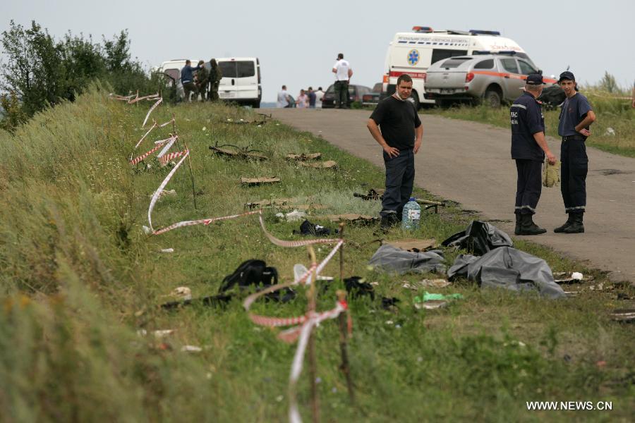 Photo taken on July 20, 2014 shows the debris at the crash site of MH17 of Malaysian Airlines in Ukraine's Donetsk region. Some 198 bodies recovered from the Malaysian airliner crash site have been loaded onto refrigerated train carriages bound for a city in eastern Ukraine, the RIA Novosti news agency reported on Sunday. (Xinhua/Alexander Ermochenko)