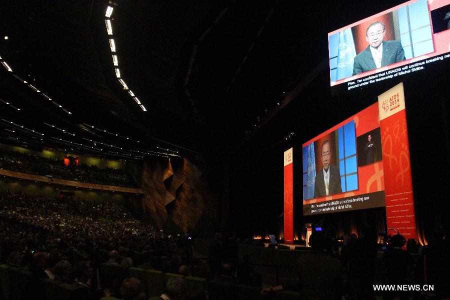 | Secretary General of the United Nations Ban Ki-moon addresses the opening of the 20th International AIDS Conference at the Melbourne Convention and Exhibition Centre (MCEC) in Melbourne, Australia, on July 20, 2014. At least six delegates heading for Melbourne to join the 20th international AIDS conference were killed in the crash of Malaysian flight MH17. (Xinhua/Xu Yanyan) |