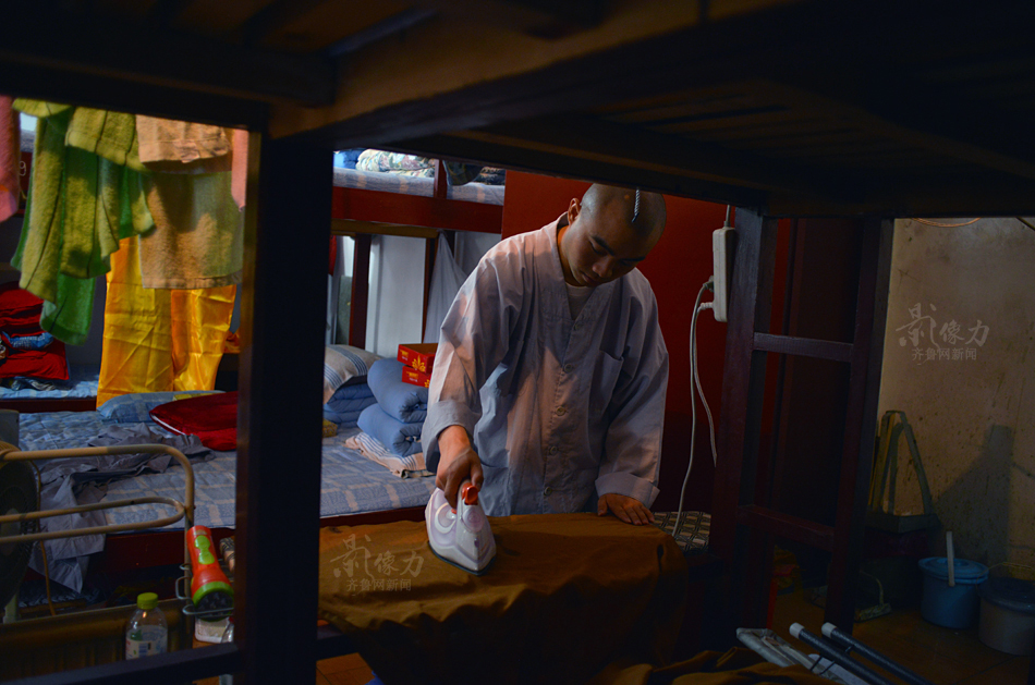 A monk does ironing at the room. (Photo/Iqilu.com)