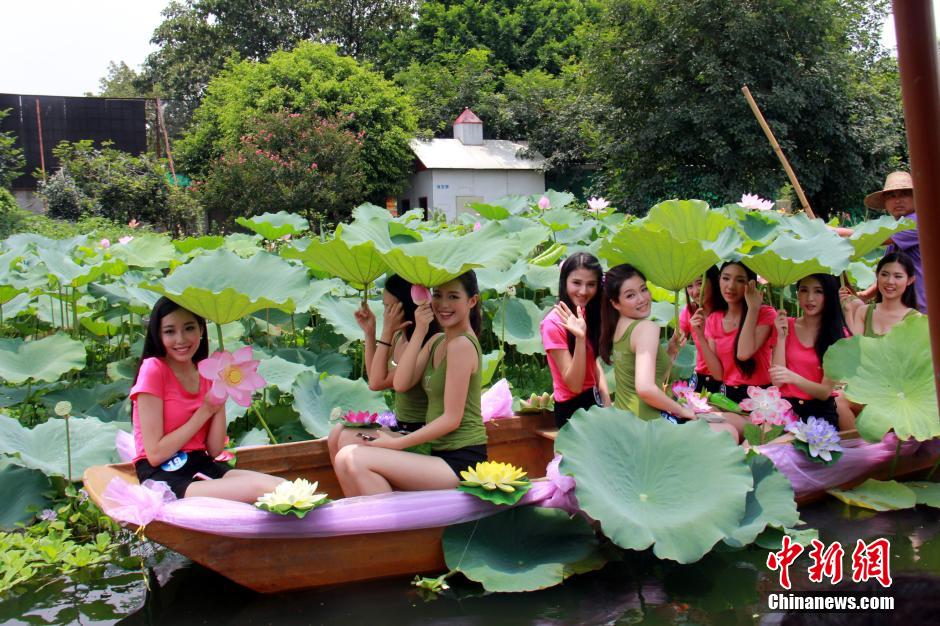 Ambassadors of Zhujiang city boat on a lake and put the floating Lotus lanterns on the water. 20 beautiful ambassadors of Zhujiang city attended the activities held in Lotus World in Foshan, south China's Guangdong province on July 20, 2014. (Photo/CNS)