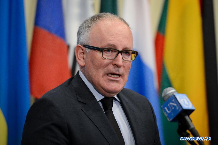 Dutch Foreign Minister Frans Timmermans speaks to media reporters after a United Nations Security Council meeting regarding the Malaysian Airlines MH17 crash, at the UN headquarters in New York, on July 21, 2014. The UN Security Council on Monday approved a resolution demanding safe and unrestricted access to the MH17 crash site, and calling for full cooperation with the international investigation. (Xinhua/Niu Xiaolei)