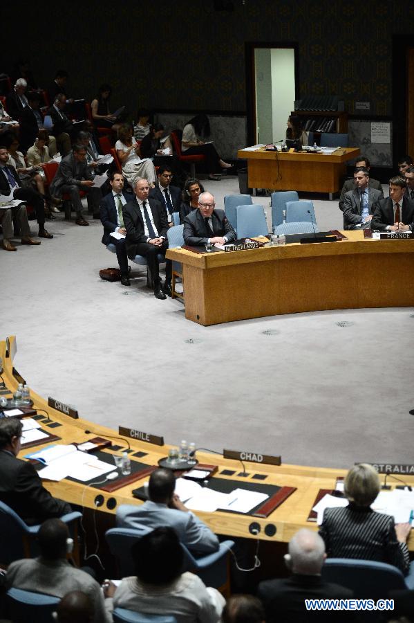Dutch Foreign Minister Frans Timmermans (upper C) addresses a United Nations Security Council meeting regarding the Malaysian Airlines MH17 crash, at the UN headquarters in New York, on July 21, 2014. The UN Security Council on Monday approved a resolution demanding safe and unrestricted access to the MH17 crash site, and calling for full cooperation with the international investigation. (Xinhua/Niu Xiaolei)