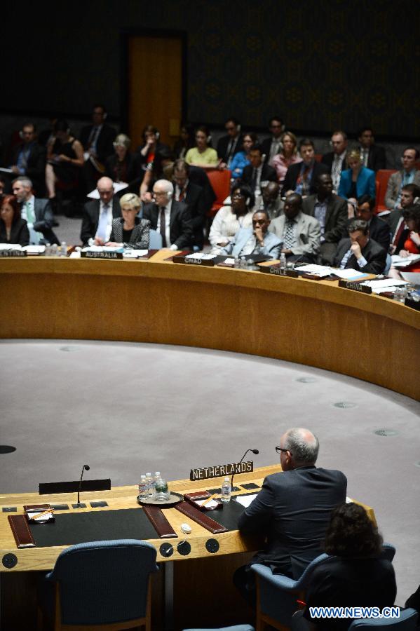 Dutch Foreign Minister Frans Timmermans (bottom) addresses a United Nations Security Council meeting regarding the Malaysian Airlines MH17 crash, at the UN headquarters in New York, on July 21, 2014. The UN Security Council on Monday approved a resolution demanding safe and unrestricted access to the MH17 crash site, and calling for full cooperation with the international investigation. (Xinhua/Niu Xiaolei)