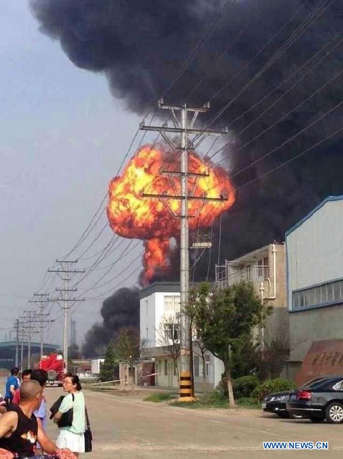 | Photo taken with a mobile phone shows fire and smoke rising in an explosion at a chemical plant in Hongze County, Huai'an City, east China's Jiangsu Province, July 22, 2014. Casualties are still unkown. (Xinhua) |