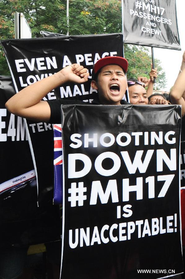 | Protesters shout slogans demanding justice for the victims of Malaysia Airlines Flight MH17 at a rally held by Malaysia's ruling United Malays National Organization (UMNO)'s youth wing outside the Russian embassy and United Nations office in Kuala Lumpur July 22, 2014. Rallies are held by UMNO's youth wing outside Russian and Ukrainian embassies in Kuala Lumpur, demanding a justice investigation of the crash of Malaysian Airlines Flight MH17. (Xinhua/Chong Voon Chung) |