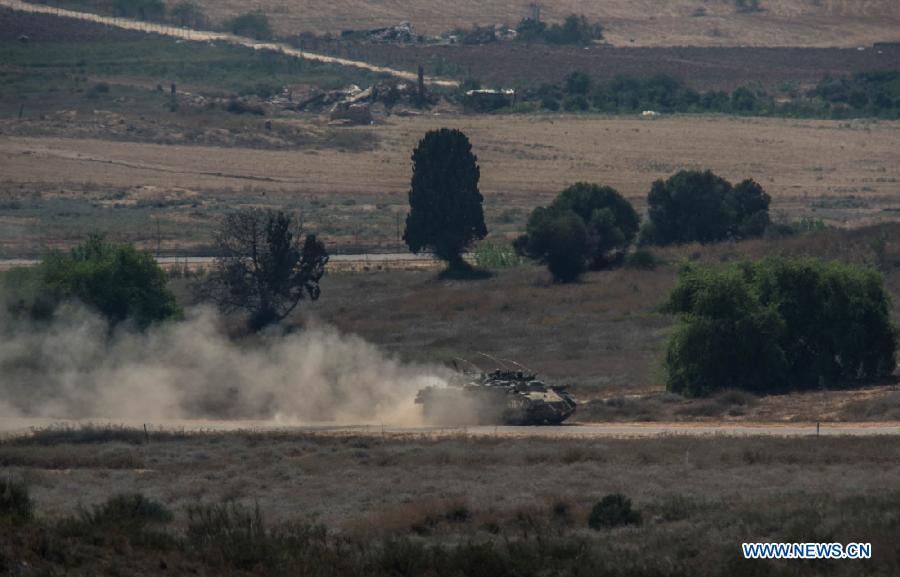 An Israeli armored vehicle runs in the northern Gaza Strip on July 22, 2014, the 15th day of Operation Protective Edge. As UN Secretary-General Ban Ki-moon is in Israel to broker a peace between the Jewish state and the Islamist Hamas movement, Israel army said it has no intention to cease its Gaza offensive before rooting out the "terror tunnels" that Hamas is using to sneak into Israel. (Xinhua/Li Rui)