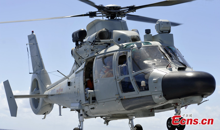 China's ship-borne helicopter is seen during the Rim of the Pacific (RIMPAC) multinational naval drill. China's navy exchanges copter landing experiences with other participating countries in the drill. [Photo: China News Service / Mao Jianjun]