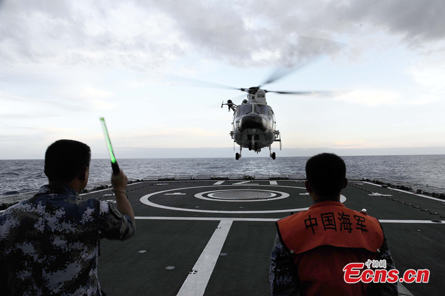 China's ship-borne helicopter is seen during the Rim of the Pacific (RIMPAC) multinational naval drill. China's navy exchanges copter landing experiences with other participating countries in the drill. [Photo: China News Service / Mao Jianjun]