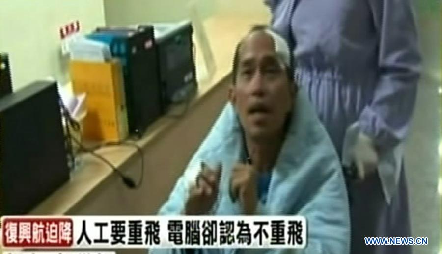 This video grab taken on July 23, 2014 shows a survivor of an emergency landing accident in southeast China's Taiwan. An ATR-72 airliner of Taiwan's TransAsia Airways, which carried 54 passengers and four crew members, was flying from Kaohsiung to Penghu, where it made an emergency landing, on Wednesday. (Xinhua)