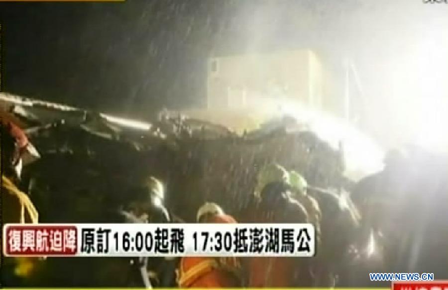 This video grab taken on July 23, 2014 shows rescuers conduct rescue work at the site of an emergency landing accident in southeast China's Taiwan. An ATR-72 airliner of Taiwan's TransAsia Airways, which carried 54 passengers and four crew members, was flying from Kaohsiung to Penghu, where it made an emergency landing, on Wednesday. (Xinhua)