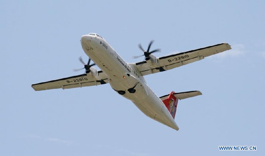 This file photo taken in June, 2009 shows the ATR-72 airliner of Taiwan's TransAsia Airways which had an emergency landing in Penghu, southeast China's Taiwan, on July 23, 2014. The airliner which carried 54 passengers and four crew members was flying from Kaohsiung to Penghu, where it made an emergency landing, on Wednesday. (Xinhua)
