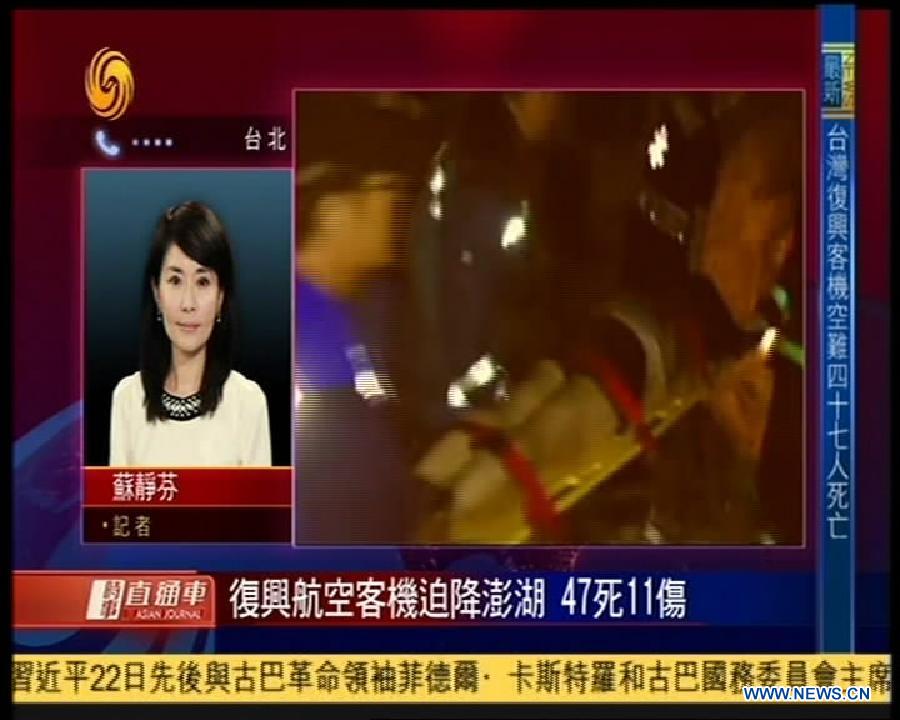 This TV grab taken on July 23, 2014 shows rescuers conduct work at the site of an emergency landing made by Taiwan's TransAsia Airways on the outlying island county of Penghu, southeast China's Taiwan. (Xinhua)