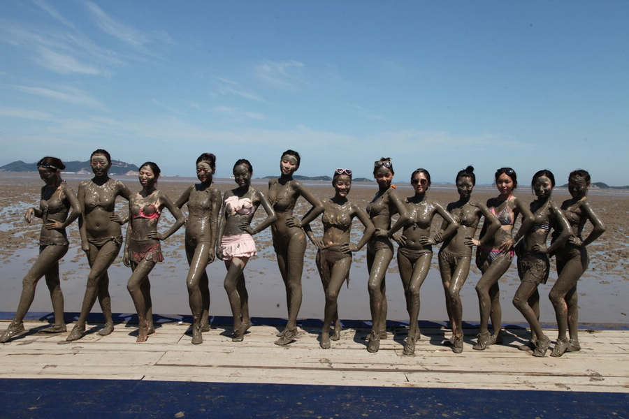 On July 22, 2014, thirty contestants to Miss Tourism China play in sea mud at the "Sea Mud Carnival" held in Xiushan, Zhoushan, Zhejiang province, attracting a largest number of tourists from Shanghai, Hangzhou, Suzhou and other cities. (Photo/youth.cn)