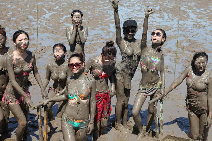 On July 22, 2014, thirty contestants to Miss Tourism China play in sea mud at the "Sea Mud Carnival" held in Xiushan, Zhoushan, Zhejiang province, attracting a largest number of tourists from Shanghai, Hangzhou, Suzhou and other cities. (Photo/youth.cn)
