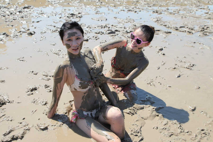 Young ladies have fun at the "Sea Mud Carnival" in Zhoushan, Zhejiang province on July 22, 2014. (Photo/youth.cn)