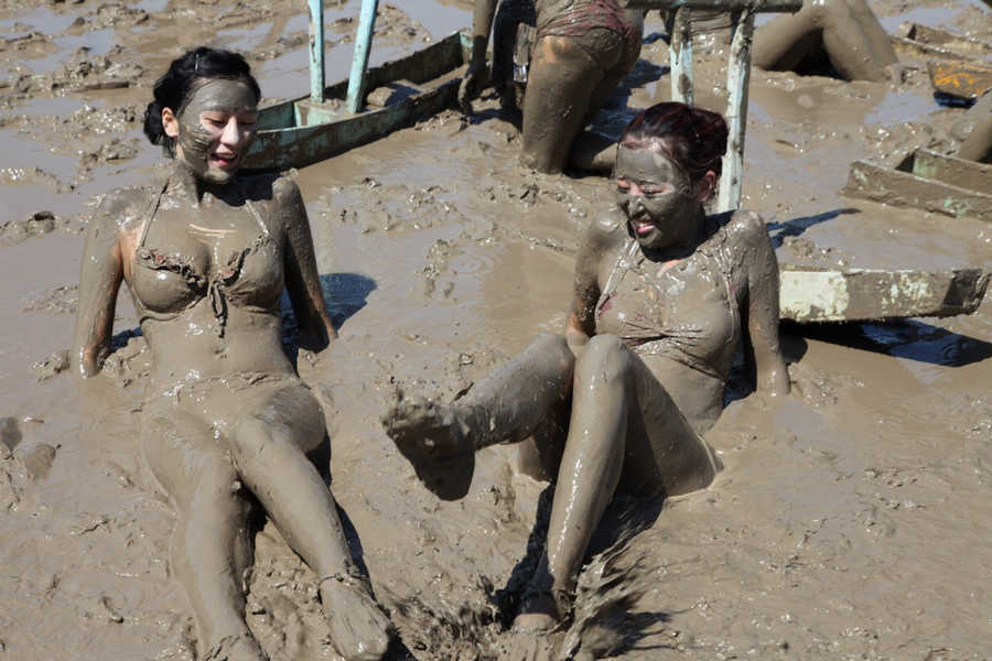 Young ladies have fun at the "Sea Mud Carnival" in Zhoushan, Zhejiang province on July 22, 2014. (Photo/youth.cn)