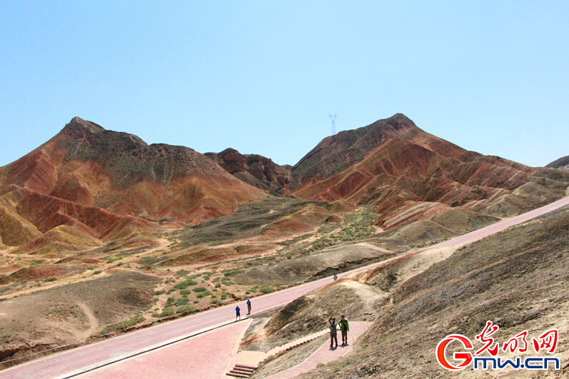 Danxia landform is seen at a geopark near Zhangye, northwest China's Gansu province on July 24, 2014. Danxia, which means "rosy cloud," is a special landform formed from reddish sandstone that has been eroded over time into a series of mountains surrounded by curvaceous cliffs and many unusual rock formations. (Guangming Online/Fang Li)
