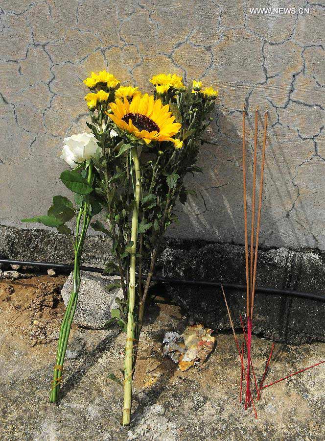 Photo taken on July 24, 2014 shows flowers at the accident site after a Taiwan plane smashed into residential buildings following a failed emergency landing in the outlying island county of Penghu, southeast China's Taiwan. Forty-eight people have been confirmed dead and 10 others injured in the plane crash, which occurred on Wednesday evening. The plane, TransAsia Airways Flight GE 222, with 58 people on board, was then on its way from Taiwan's Kaohsiung to Penghu. Family members of victims of the accident held memorial service at the site for their beloved ones on Thursday. (Xinhua/He Junchang)